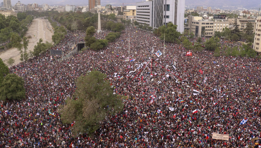 El 25 de octubre, la respuesta popular fue incontrastable: 1.200.000 chilenos se movilizaron sólo en Santiago, según cifras oficiales. Millones se movilizaron a lo largo de Chile en la “Marcha Grande”. La huelga general convocada por la CUT fue contundente. Con ellos marchaban también Luis Emilio Recabarren y Elías Lafertte, Salvador Allende y Pablo Neruda, Violeta Parra y Víctor Jara con su guitarra al viento. Y con ellos un grito que atravesó las montañas de los Andes, sobrevoló sus cumbres con los cóndores y cruzó las aguas bravas del Pacífico: ¡Renuncia Piñera!